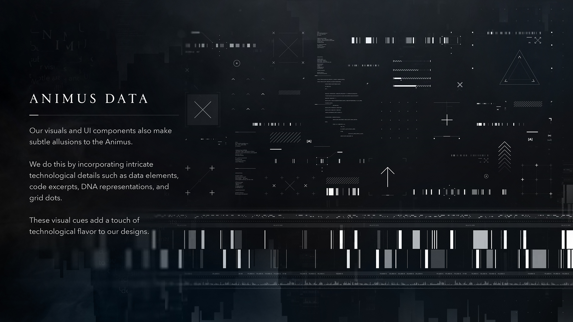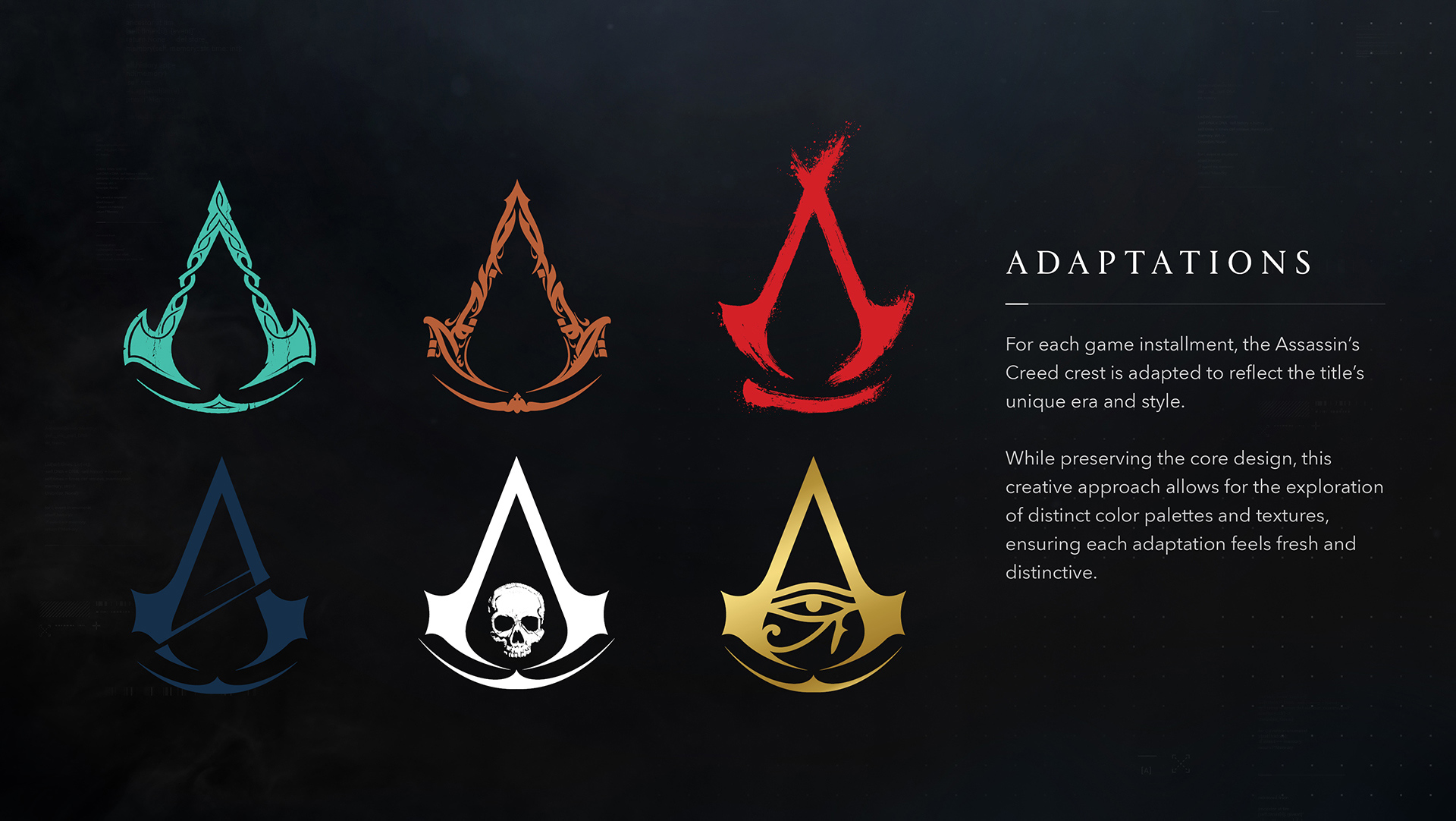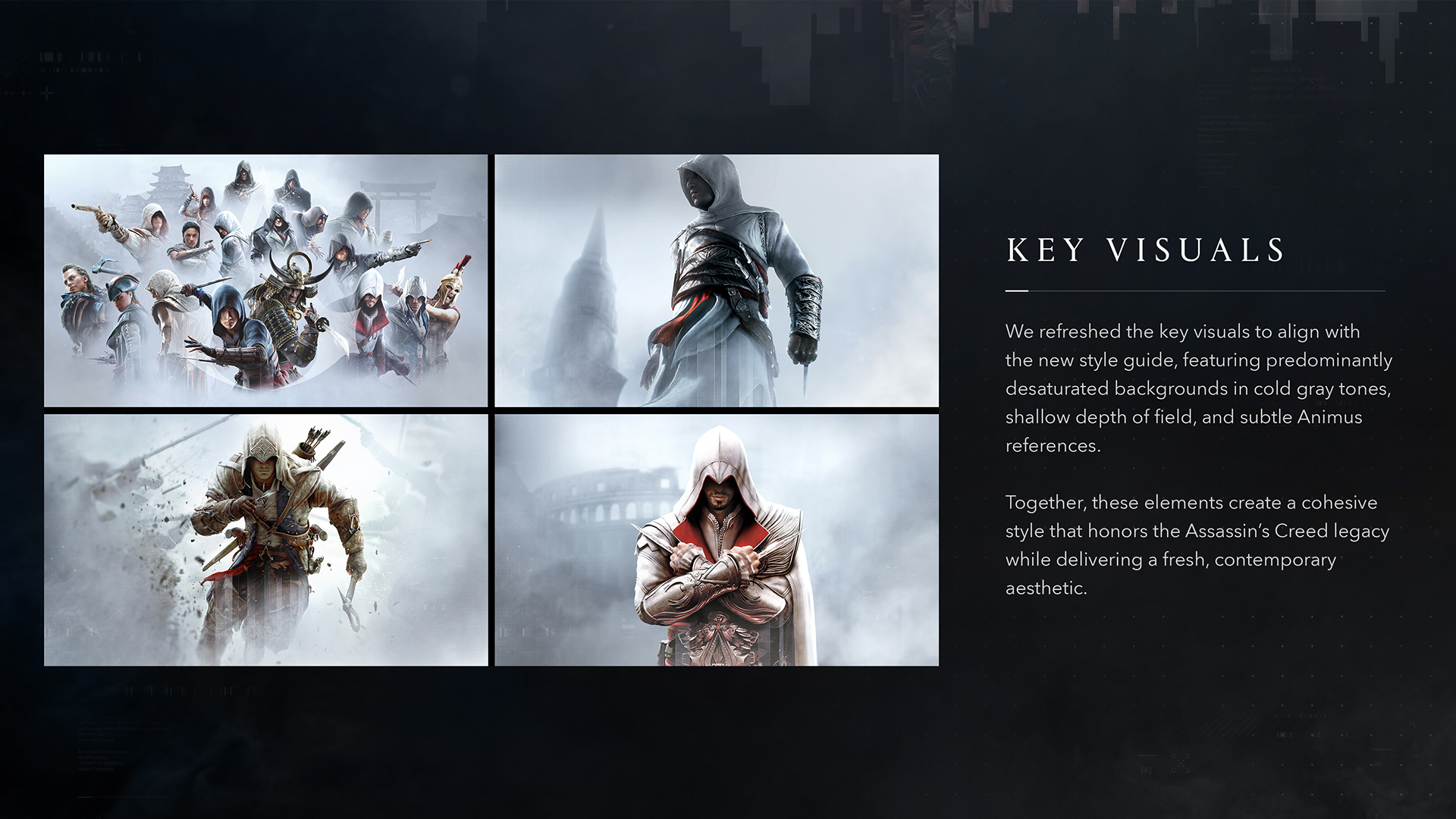 We carried out a major overhaul of the visual assets, introducing a modern cold silver tone paired with subtle Animus glitch effects. Many of the franchise’s iconic key artworks were reimagined to feel both contemporary and true to the brand’s legacy. We clarified key lore elements, such as the Animus, by developing a dedicated visual language and supporting assets.